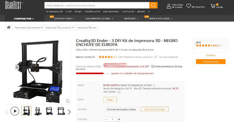 Tú decides, yo en concreto la cogí por Gearbest aprovechando el cupón descuento que tengo (para aplicarlo solo tienes que meterte en la página de producto de la Ender 3, meterlo al carrito y canjear el código: GENDER 3).